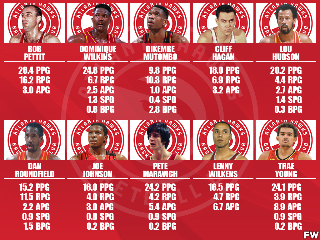 Pettit was an MVP in his second season after winning the Rookie of the Year. Petit was the all-time leader in scoring until Wilkins broke his record in the 90s. Petit (20,880) and Wilkins are the only Hawks players to score over 20,000 points in their tenure with Atlanta. Pettit ranks in the top-3 in games played, field goals, assists, and triple-doubles. He is the all-time leader in rebounds (12,849) and his 16.2 rebounds per game are one of the best all-time. He also is the franchise leader in free throws made and attempts.