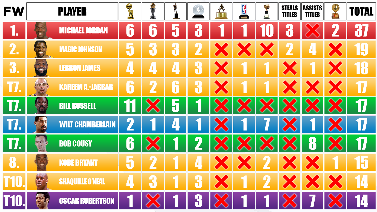 Today, we will focus on the latter as we dive into the 10 NBA players who have accumulated the most accolades and accomplishments. We will be taking a look at everything from MVP awards to assists titles as we try and uncover the most accomplished players in NBA history. Now, this is assuming that we put all of these accomplishments on a level playing field, which they are not in terms of importance to one’s legacy. Championships, Finals MVP awards, and MVP awards will always be number one in terms of what matters most, but the other accomplishments do hold weight in these conversations. Without any further explanation, let us dive in.