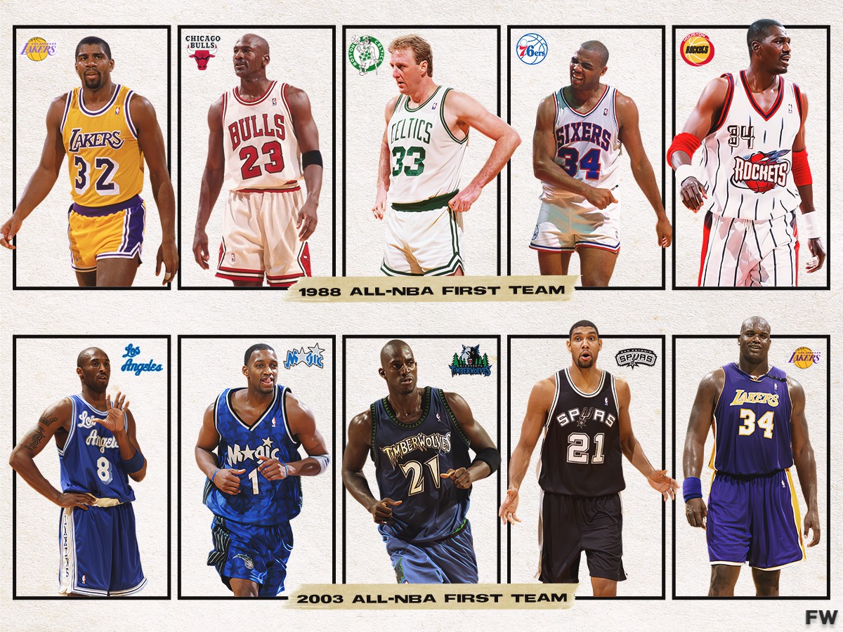 Arguably two of the most stacked All-NBA First Teams came in 1988 and 2003. These teams both had top-25 players in the history of the game, with many of them claiming spots in the top-10 of all-time. In 1988, the NBA was run by the MVP in Michael Jordan, the superstar presence of Larry Bird, and the Finals MVP in Magic Johnson. Not to mention, Charles Barkley and Hakeem Olajuwon were the two most dominant big men in the game. Jordan led the NBA in scoring at 35.0 PPG and also captured the Defensive Player of the Year Award in a historically great season.