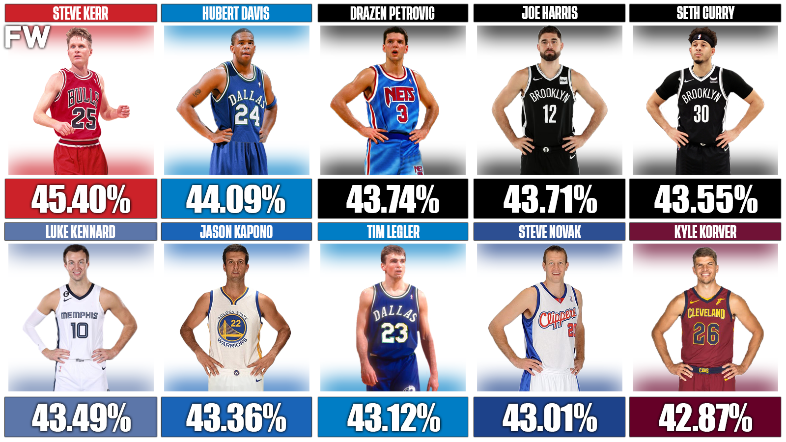 Without further ado, here are the 20 best three-point shooters of all time based on career percentage.