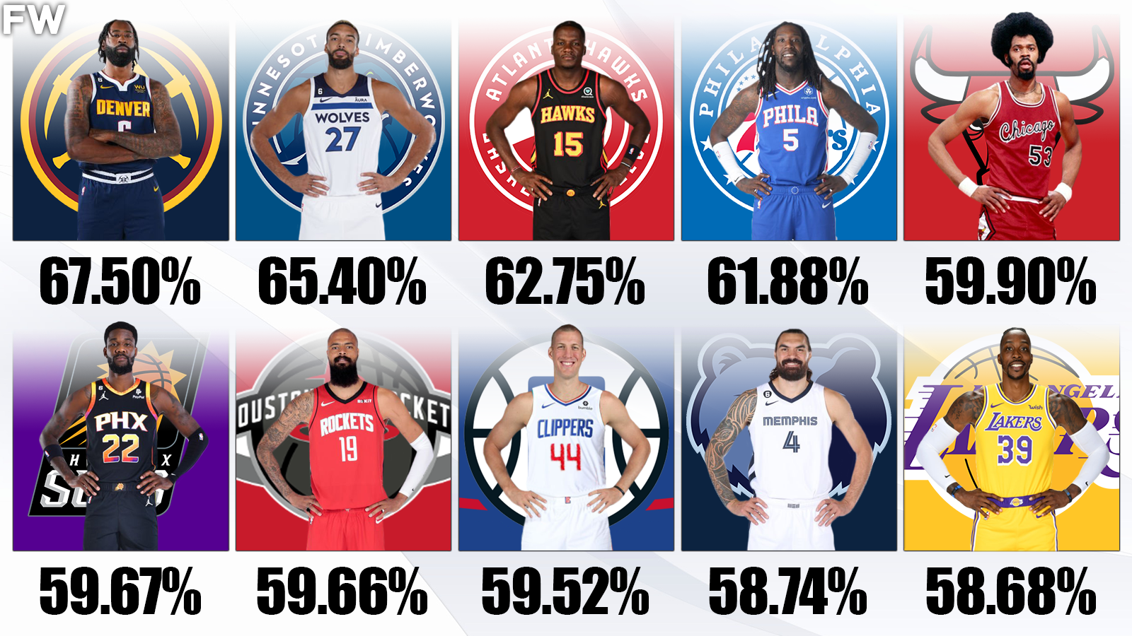 Clint Capela is another center that appears on this list despite not being a consistent shooter or scorer by any means. The Swiss-born big man is tall at 6’10” but has improved as a finisher at the rim since his days with the Houston Rockets when James Harden was feeding him lobs. He shot 63.4% from the field during his career with the Rockets.