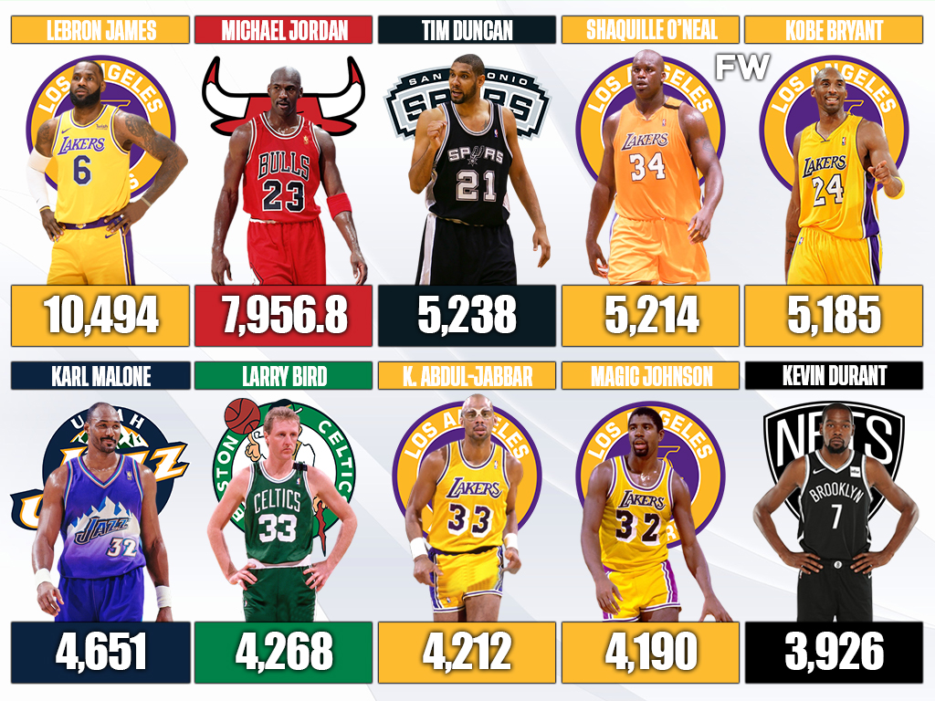 When Shaq left, Bryant’s totals went up, which included winning 1,100 points when he won the MVP Award in 2008. There were seven times that Bryant had at least 400 points or more. After a while, that adds up, which is why Bryant made the top-5.
