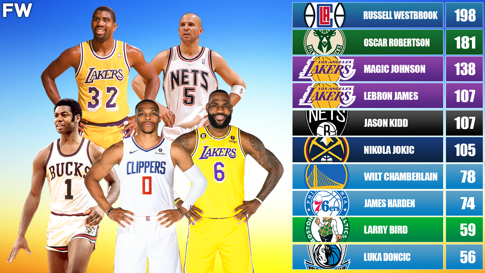 These are the 20 NBA players who have recorded the most triple-doubles in history.