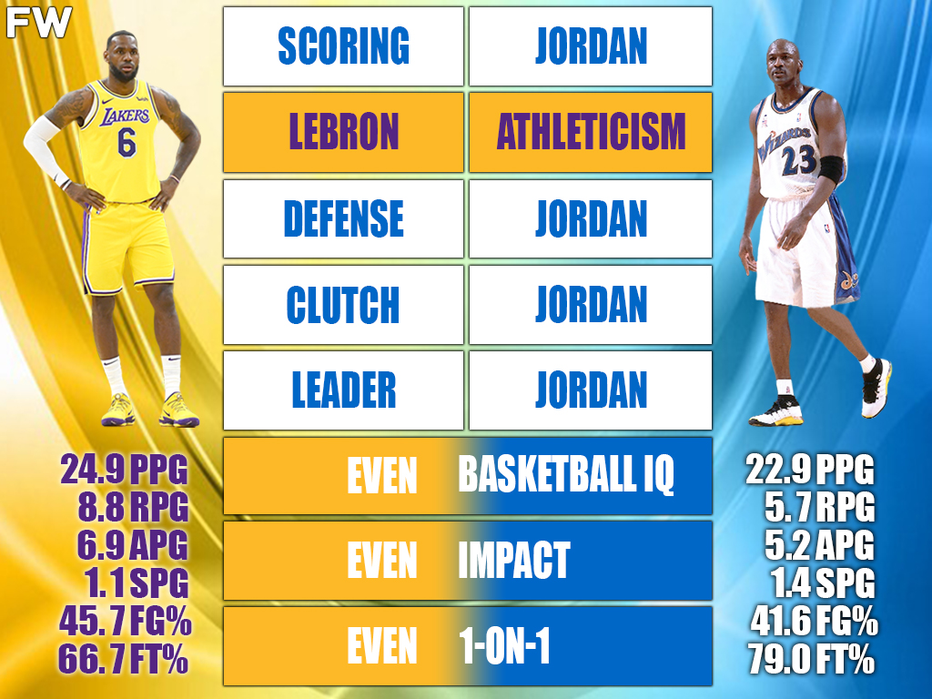 Michael Jordan was a special offensive player and a gifted scorer, but he has not done enough to gain the edge over a superstar of James’ caliber. He was scoring the ball well at the time and made a strong case for somehow leading the Wizards in the playoffs, although he fell short by a few games. Michael’s offensive bag was very high, and when he lost his athleticism, he could score the ball in one-on-one situations. Defensively, he was better than LeBron, but he did not have The King’s passing or rebounding ability. This one has to be even because their positive and negative attributes cancel each other.