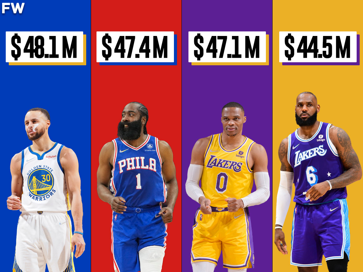 In the 2022-23 season, 4 players will make $187.1 million combined. Stephen Curry leads the pack with $48.1 million from the Warriors, followed by James Harden, who will receive $47.4 million if he opts into the final year of his contract with the Philadelphia 76ers. Two Lakers are 3rd and 4th, as Russell Westbrook will make $47.1 million while LeBron James will make $44.5 million.