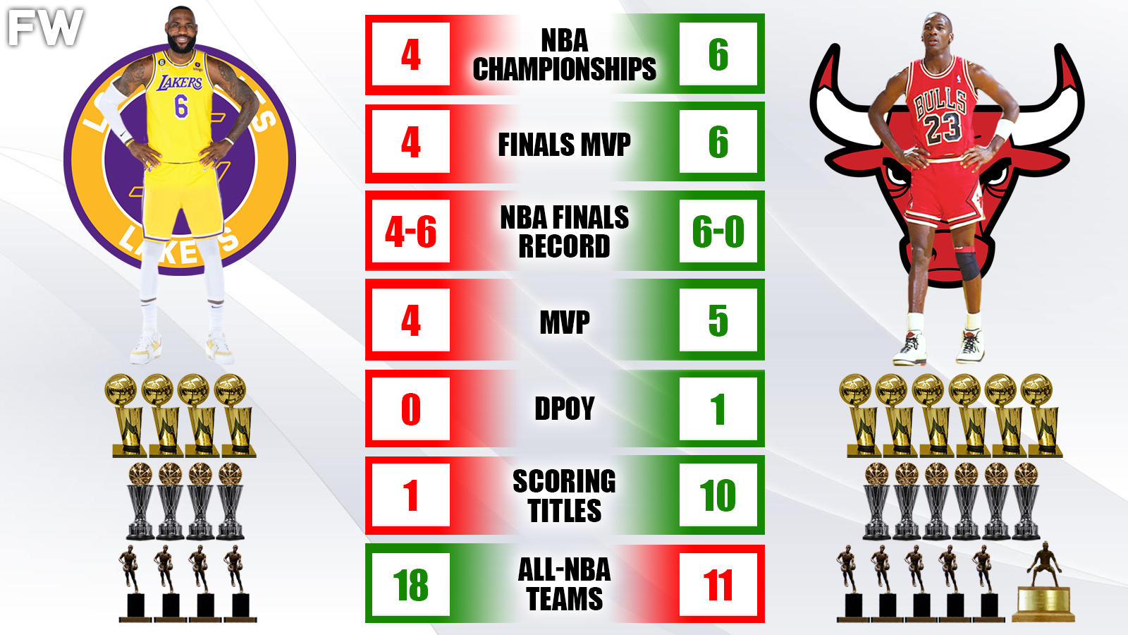 Jordan’s greatest collection of accolades comes in the form of NBA championships and Finals MVP awards, as those should be the highest-ranked achievements among all players. No regular season award can compare to championships and Finals MVPs, and Jordan has the edge in those as well. LeBron’s 4 Finals MVP awards are certainly impressive as it ranks 2nd all-time behind MJ, but second place is what James is in right now.