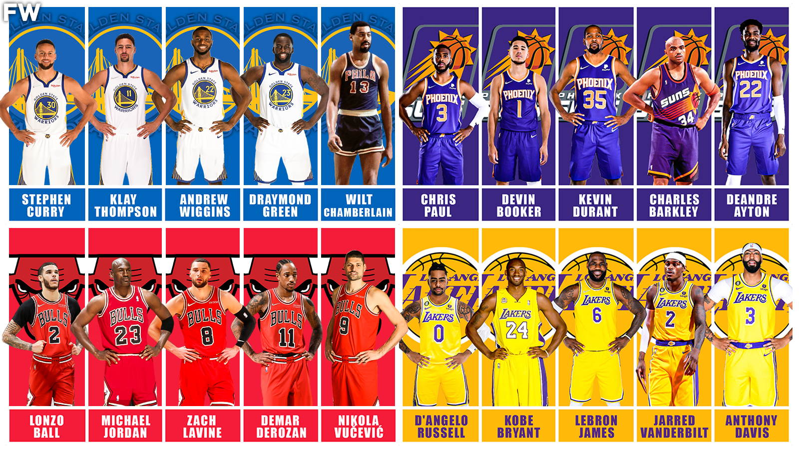 Stephen Curry, Klay Thompson, Andrew Wiggins, Draymond Green, and Wilt Chamberlain