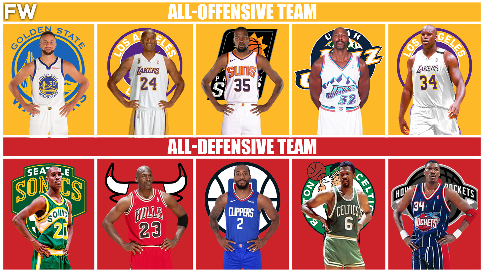 Just as there were obvious advantages for their opponents, there are too for the All-Defensive Team. Leaving those out of the equation, one of the first advantages I notice is the incredible two-way play of the All-Defensive Team. There are far better offensive players on the All-Defensive Team than there are defenders on the All-Offensive Team. Gary Payton is a former 20.0 PPG scorer, and Michael Jordan is, well, the GOAT. Kawhi Leonard is another scorer when he finds his rhythm and Hakeem Olajuwon is a highly-skilled offensive threat. When looking at the defense for the All-Offensive Team, only Bryant and Shaq hold that same two-way threat that most of the All-Defensive Team does.