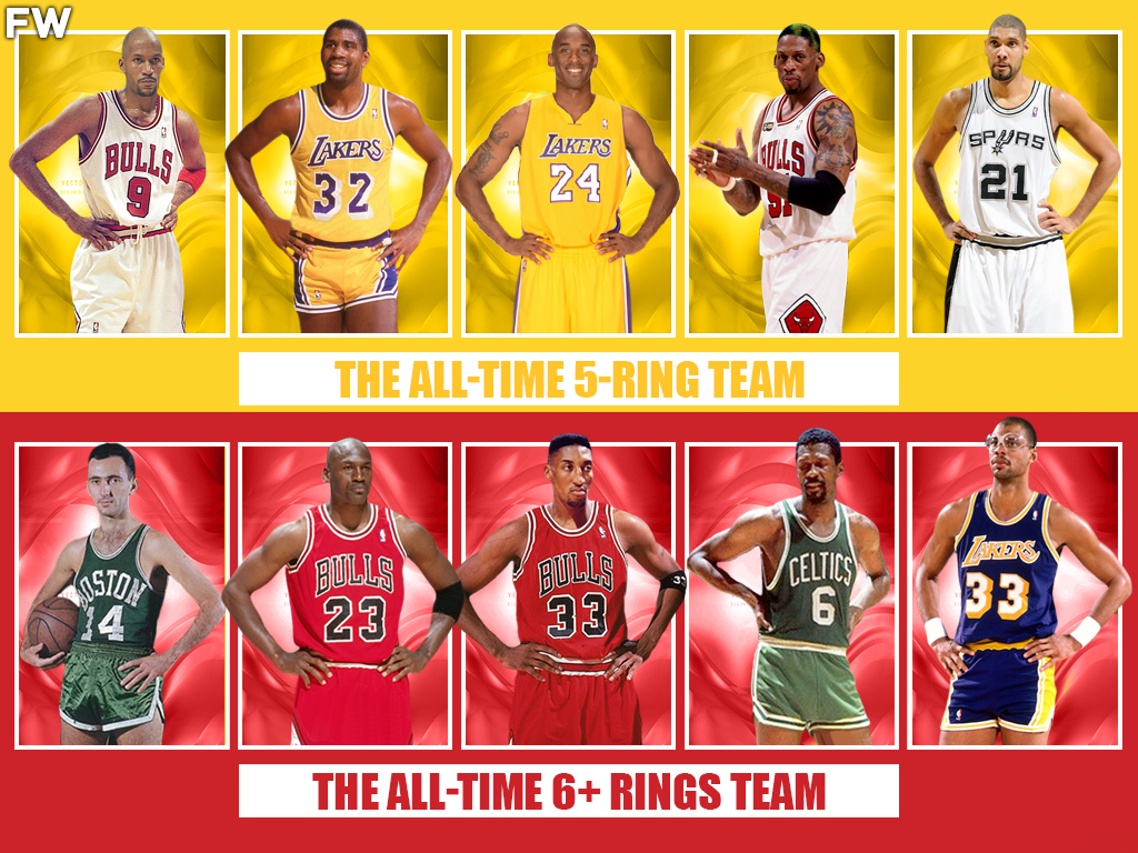 We have analyzed the all-time four-ring squad and what would be the outcome against a starting all-time five-ring team. We looked at the four-ring squad and produced a hypothetical against a six-ring squad as well. The five-ring squad features Ron Harper, Magic Johnson, Kobe Bryant, Dennis Rodman, and Tim Duncan. For this selection, we chose players that have specifically five rings. That means six-time champions Michael Jordan and Scottie Pippen are excluded because they were six-time champions.