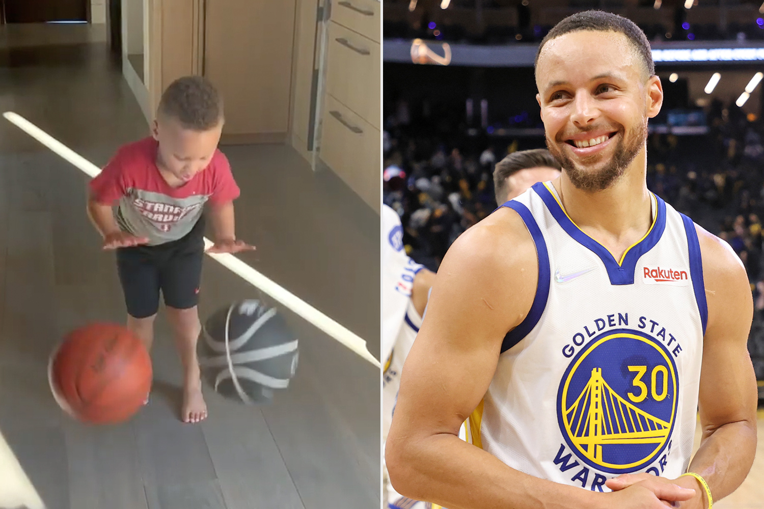 Ayesha Curry shared a video of Canon imitating his father’s two-handed dribble routine on her Instagram story. For a 3-year-old, that handle is tighter than a lot of adults.