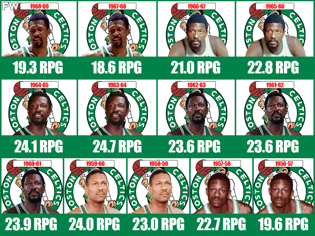 Russell spent most of his career either winning rebounding titles or battling his longtime adversary Wilt Chamberlain. Here is a look at his season-by-season rebounding averages.