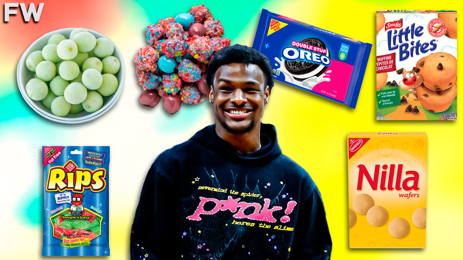 Bronny was asked about his five favorite snacks and he listed out a great bunch, featuring Frozen Cotton Candy Grapes, Rips Candy, Nilla Wafers, Double Stuff Oreos, and Little Bites (the birthday cake kind).