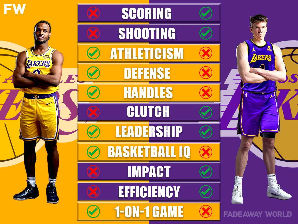 The Los Angeles Lakers have yet to make a splash in free agency but make headlines in the 2024 NBA Draft by taking Dalton Knecht No. 17 overall and Bronny James No. 55 overall. The Lakers season in 2024-25 will be filled with drama and expectations, especially regarding the play of their two rookies. Looking ahead to next season, it might be interesting to compare the skill sets of Bronny James and Dalton Knecht to get an idea of who the better player is right now.