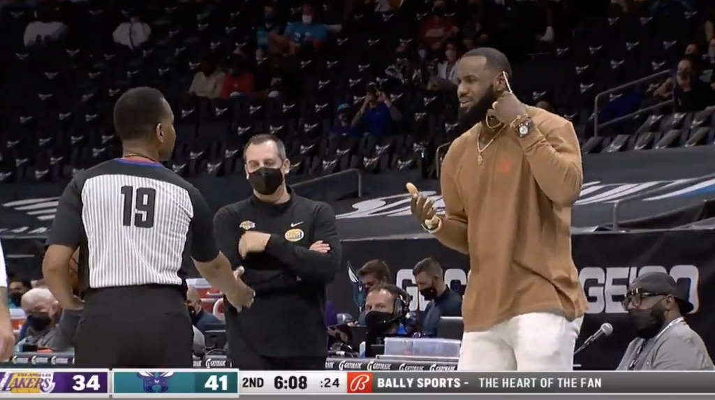 Even when he’s not playing, Bron is active and participating in the game, batting for his team with the refs, and seemingly giving them some thoughts on the game plan.