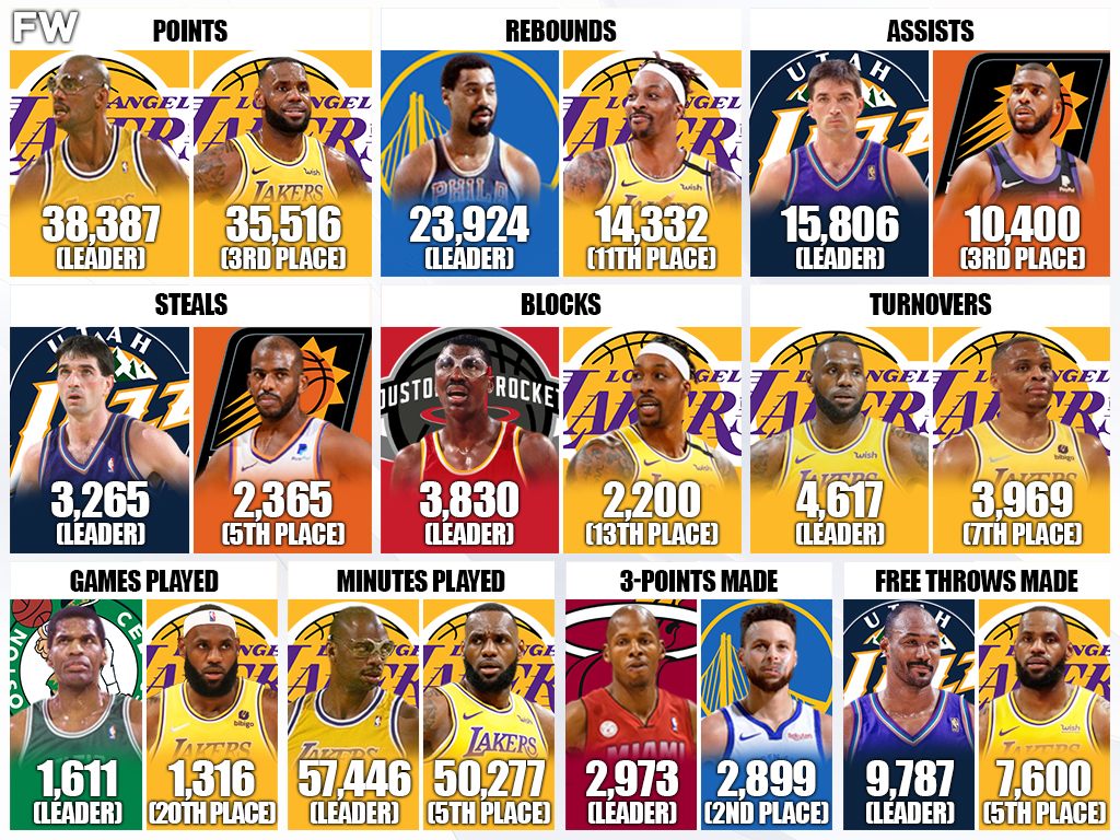 For Lakers fans, it might be a kick to the gut that two of the players in the starting lineup rank in the top-10 in all-time turnovers. The leader in all-time turnovers, and still counting, is LeBron James. By the time LeBron finishes his career, he could be close to 5,000 turnovers. Then again, who cares? LeBron is close to becoming the all-time scorer. All this says is that LeBron has the ball in his hands a lot.