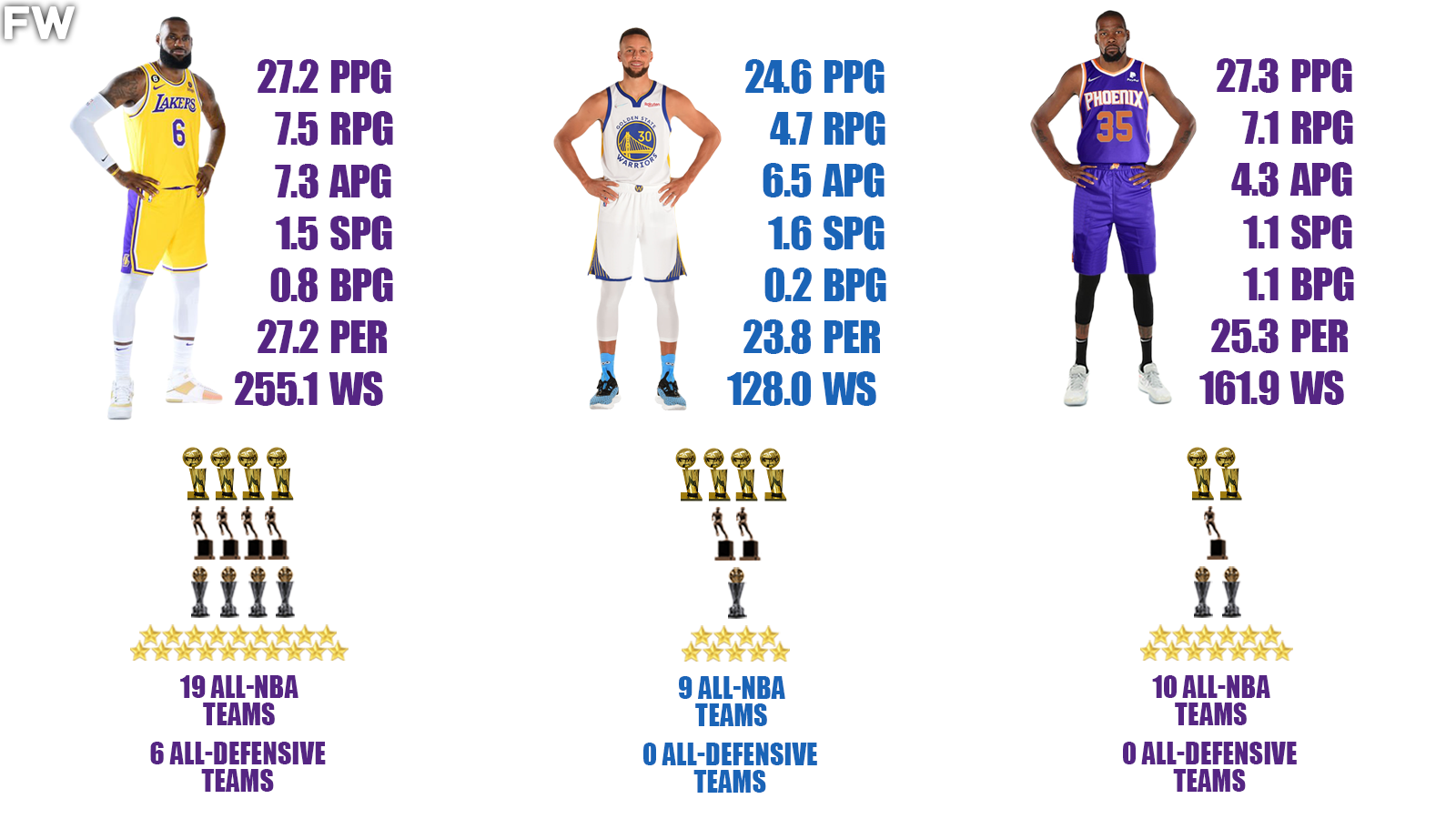James’ 27.2 PER is the third-highest rating in NBA history, trailing only Michael Jordan and Nikola Jokic. Kevin Durant’s 25.3 rating is ninth in NBA history as well and Stephen Curry’s 23.8 rating ranks 20th. As you can see, they are three of the most efficient players in NBA history and the right to be compared is more than well-deserved.