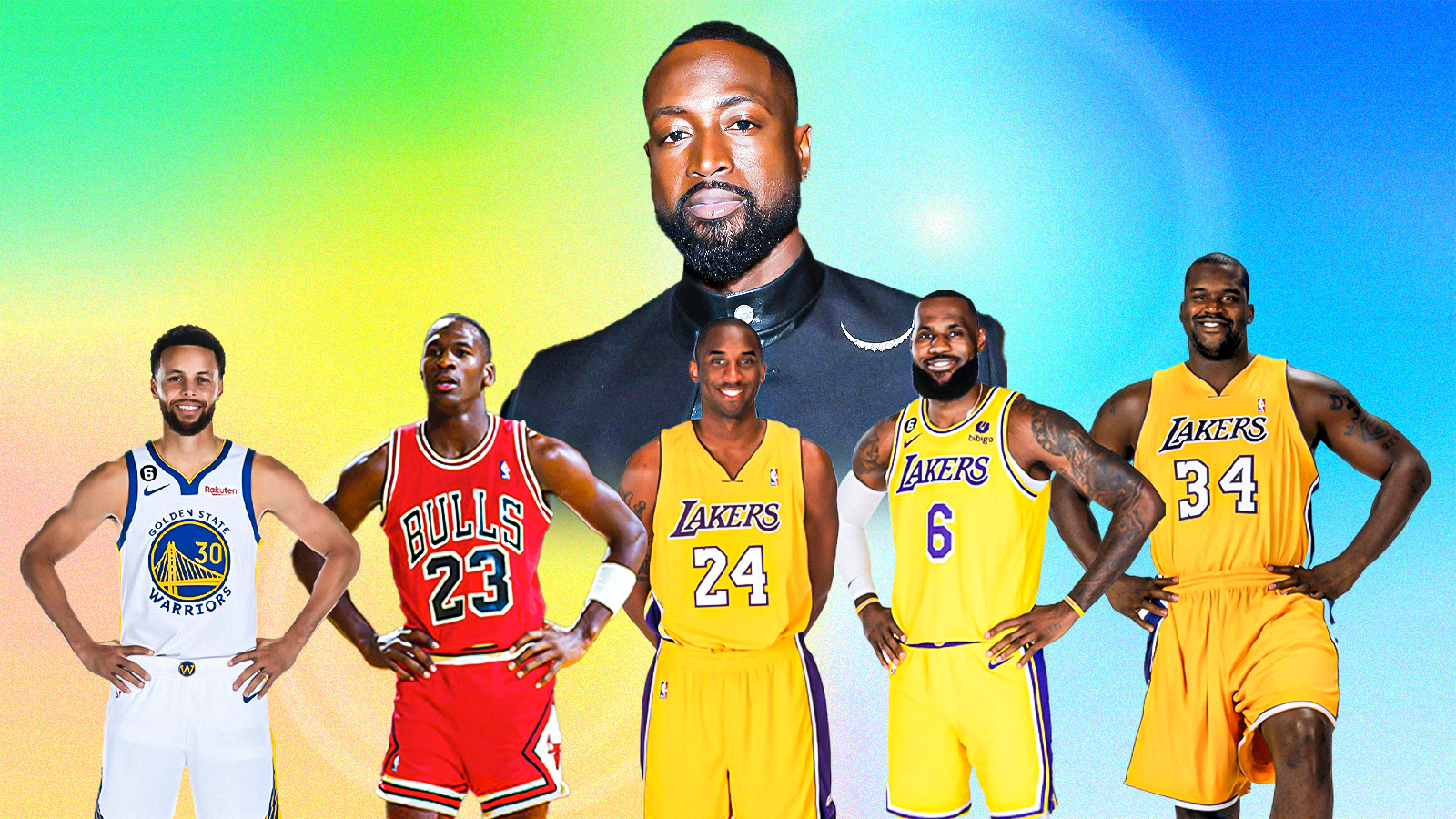 Wade’s team features Stephen Curry at point guard, Michael Jordan at shooting guard, Kobe Bryant at small forward, LeBron James at power forward, and Shaquille O’Neal at center.