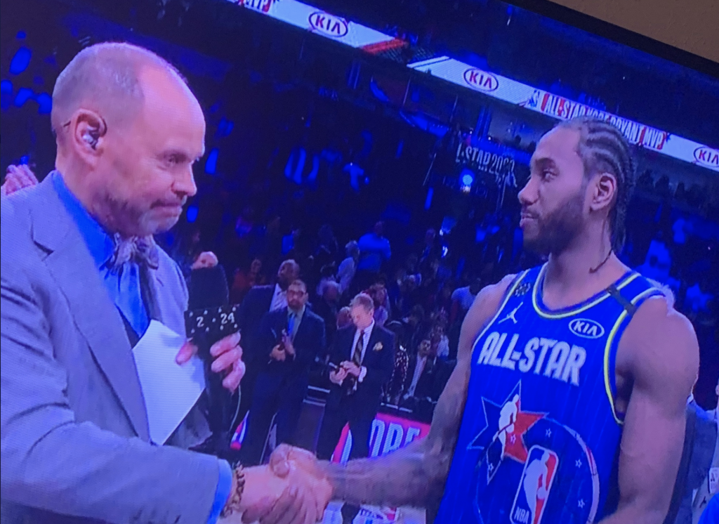 Ernie Johnson Caught Wincing As He Shakes Kawhi Leonard’s Hand After Winning The Kobe MVP Award