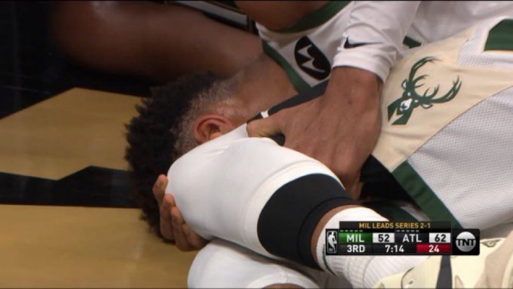Giannis Antetokounmpo took a hard hit in Game 4, catching the body of a Hawks player on his leg and hyperextending his left knee.