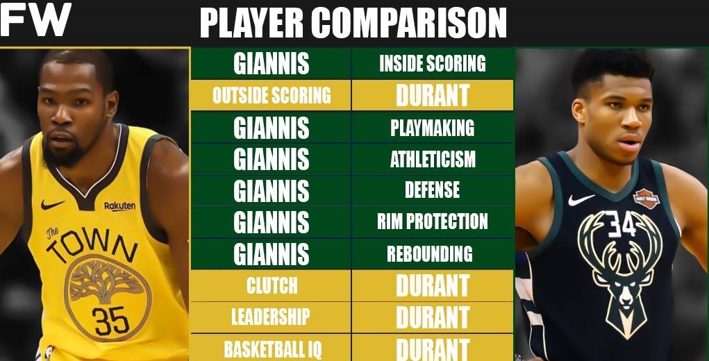 Giannis Antetokounmpo has grown through his mistakes, but he’s still has a lot to learn. He often tends to settle for the bully ball and force things in the offense, while Durant is one of the smartest guys you’ll find on an NBA hardwood. He’s a great facilitator, helps spread the floor, is great at switching on defense and knows how to do a little bit of everything.