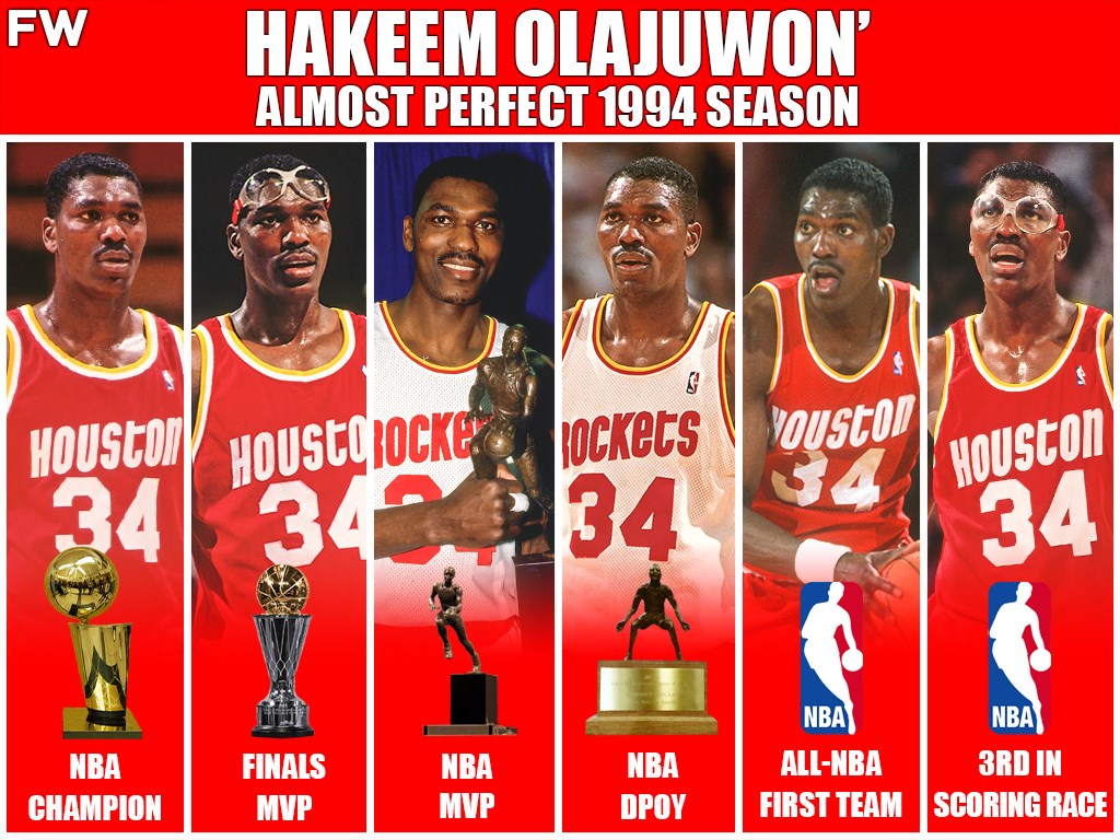 With Jordan out of the picture, Olajuwon quickly jumped up as the face of the league. The Houston Rockets won the first of their back-to-back championships with Olajuwon winning MVP, Defensive Player of the Year, and Finals MVP. Had Olajuwon been able to score a few more points each night, he would have had a perfect season.