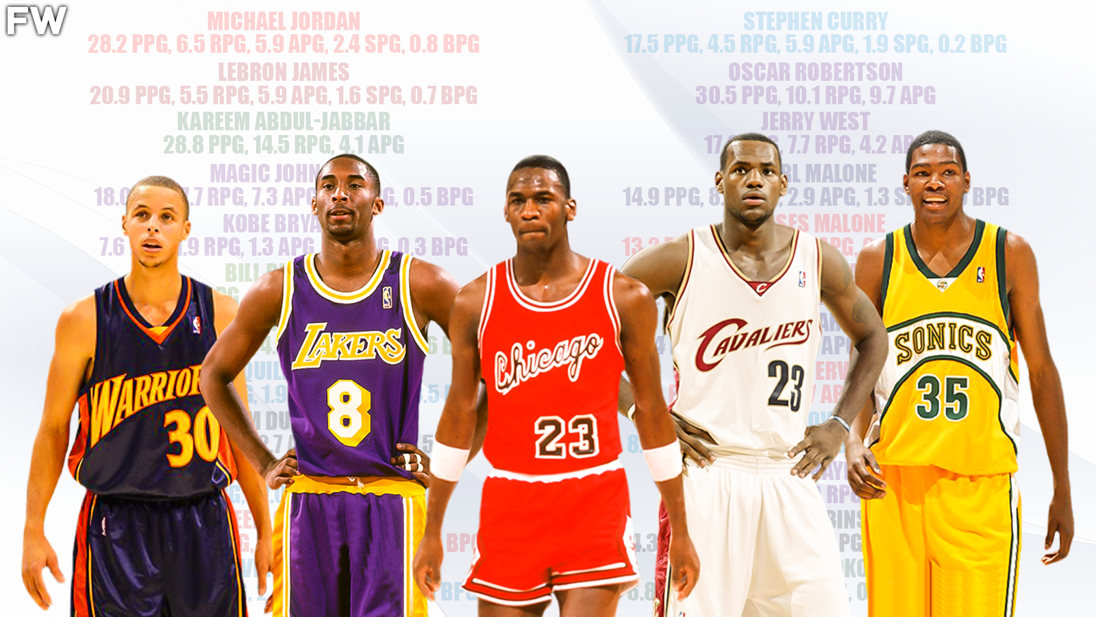 What else is there to say for Bill Russell during his NBA career? He is the only NBA player in history with 11 championships and he won the second-most MVPS with five. Russell is highly regarded as the best winner, rebounder, and defender in NBA history. He was a blessing on and off the court for all that knew him and he forever changed the way the game is played with his dominant style. Overall, he was an All-Star 12 times, an ALl-NBA Team selection 11 times, and an All-Defensive team selection once.