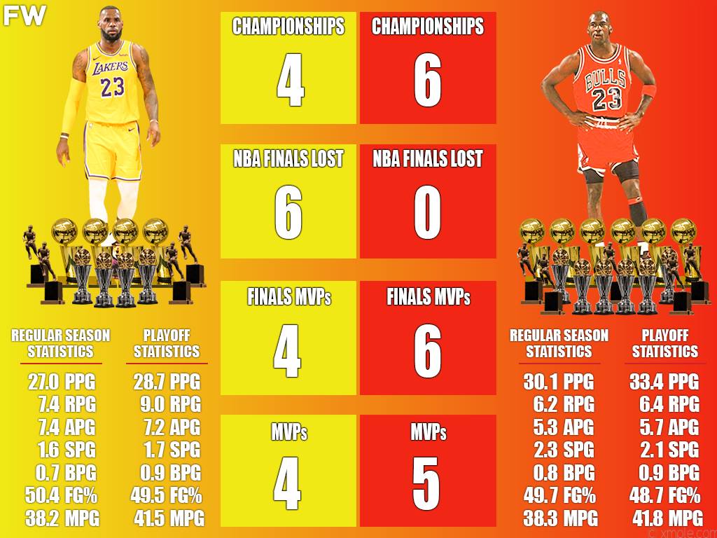 LeBron James has incredible achievements, but they do not compare to Michael Jordan’s. His Airness has 6 titles, 6 Finals MVPs, and 5 MVPs compared to LeBron’s 4 rings, 4 Finals MVPs, and 4 rings. As great as LeBron James is, those are factual evidence that Jordan achieved more when it came to dominance and winning.