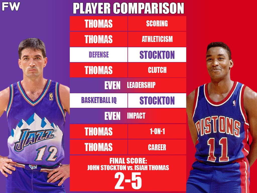 John Stockton may hold the advantage in individual statistics such as being the all-time leader in assists and steals, Isiah Thomas managed to win 2 straight NBA championships as arguably the best player on his team. Stockton had the privilege of playing with Karl Malone yet could not capture a single championship.