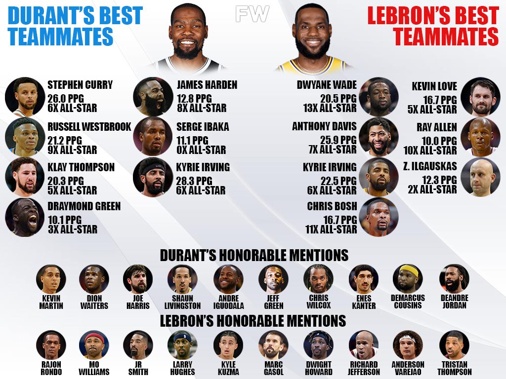 LeBron James had 2 bonafide superstars in Dwayne Wade and Anthony Davis, but the difference is that LeBron played with Ray Allen and Zydrunas Ilgauskas when they were past their primes. Durant played with 7 star players in their primes and had the advantage of playing in 3 separate Big Threes while LeBron had 2. James also has Anthony Davis alongside the likes of Montrezl Harrell and Dennis Schroder, but Durant edges him slightly.