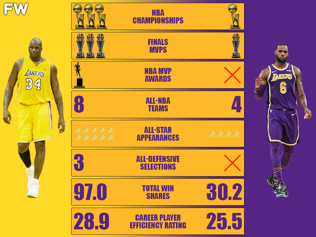 But again, James has played less than Shaq as a member of the Lakers and is not in his prime as Shaq was. Therefore, he pales to the superstar center in terms of total All-NBA selections.