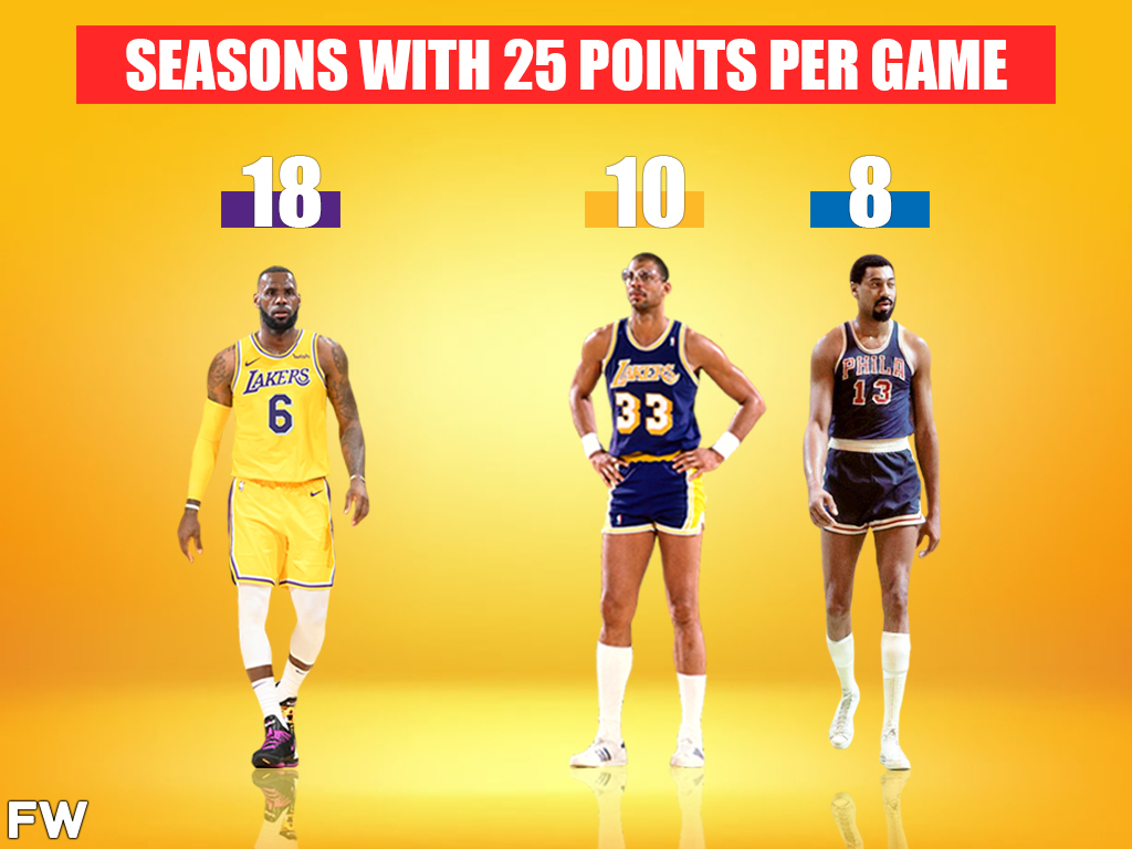 In comparison, Kareem Abdul-Jabbar, the NBA’s all-time leading scorer, has only had 10 seasons in his career where he averaged 25 points per game. And Wilt Chamberlain, a player with some of the most ridiculous scoring numbers of all time, has only 8 such seasons. LeBron has the same amount of 25 points per game seasons as Wilt and Kareem combined.