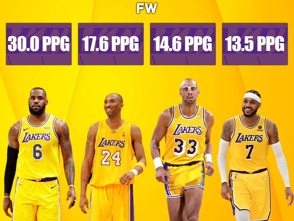 LeBron is averaging 30 points per game. In comparison, Kobe Bryant averaged 17.6 points per game in his final season, and Kareem averaged 14.6. Carmelo Anthony, who like LeBron, is playing in his 19th season this year, is averaging 13.5 points per game. The numbers from Kobe, Kareem, and Melo are impressive considering their age, but James’ numbers are truly unbelievable, given that he is also the same age as them.