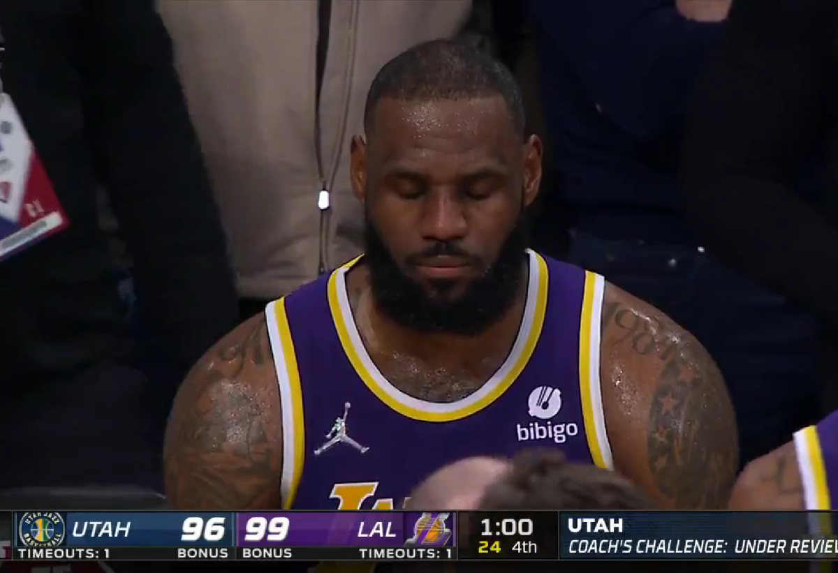 With one minute left on the game, James was spotted meditating on the Lakers’ bench while the officiating crew reviewed a Jazz challenge. TV cameras caught the moment when LeBron closed his eyes and did some breathing exercises to stay calm.