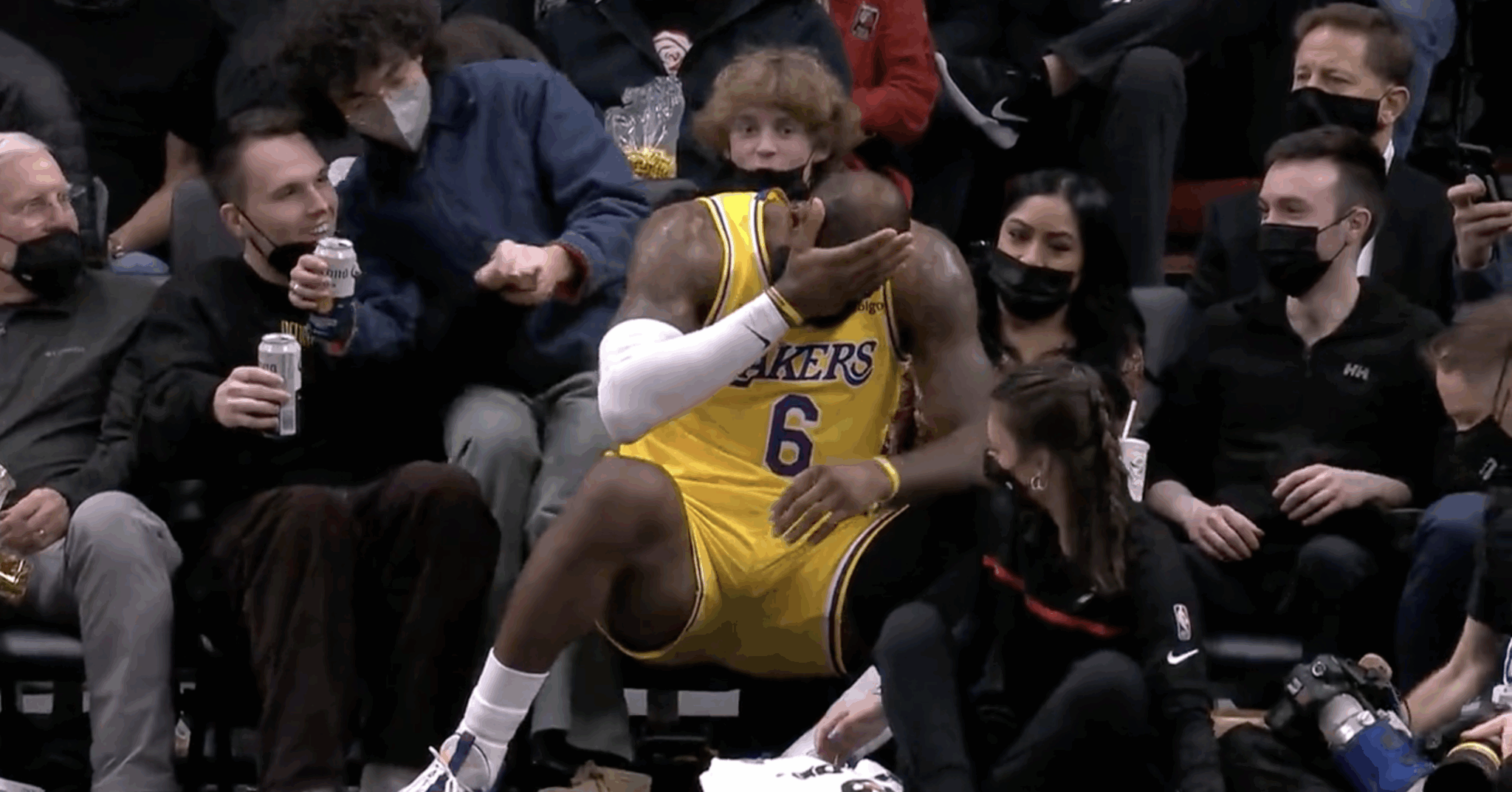 During the game, LeBron James drove to the basket for a layup. While he made the shot, James did get hit in the face pretty hard. As the Blazers brought the ball up the other side of the court, James went on to cover his face and take a seat among the Trail Blazers fans sitting courtside.
