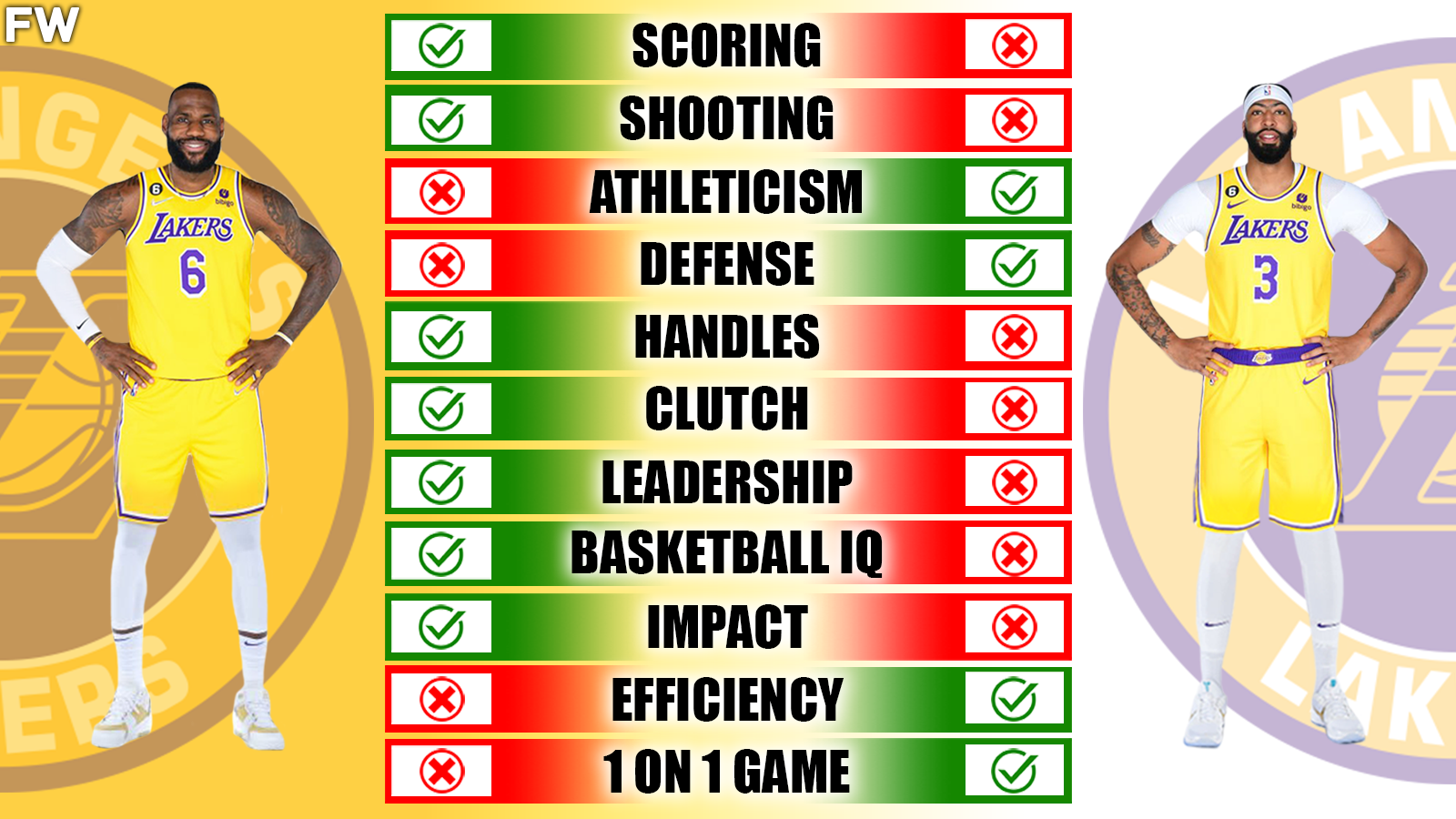 Meanwhile, Anthony Davis is a skilled inside scorer with great footwork and agility, making him tough to guard in the paint. His length and athleticism allow him to get to the rim quickly, and his shooting ability from outside the arc adds another dimension to his game. He’s also a strong defender who can switch and guard multiple positions effortlessly. In two-way play, Davis edges James, but he is also a better one-on-one player right now due to his age and size. Defensively, Davis can also handle any one-on-one situation.