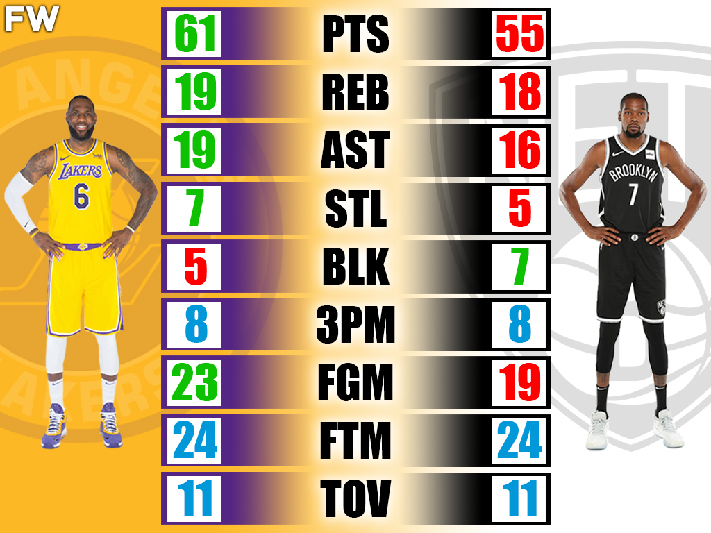 The night he scored his career-high 55 points, Durant shot 8-10 from three in a game that went down as a loss for Brooklyn. Durant has knocked down 6 or more threes in a game 17 times in his career, and LeBron has done that 28 times in his career.