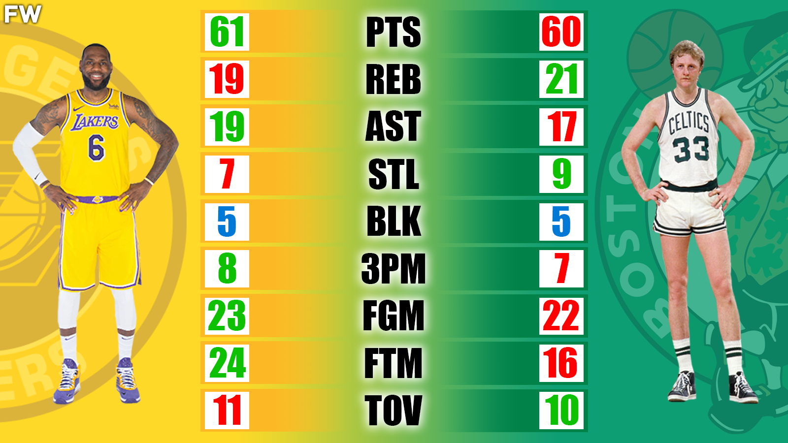 In this article, we delve into the captivating realm of career-high performances, where the indomitable spirits of James and Bird intersect. We explore the statistical achievements, awe-inspiring moments, and unforgettable displays of basketball brilliance that have defined their careers. Without further ado, here is the comparison between James and Bird as it pertains to the major category performances including points scored, rebounds, assists, steals, blocks, three-pointers made, field goals made, free-throws made, and turnovers.