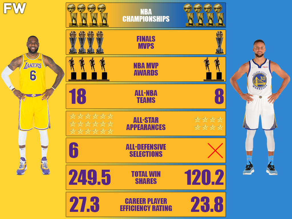 But as great of a shooter, as Curry is, LeBron has better all-around statistics on both ends of the floor along with many more accolades. It is simply hard to argue against 4 MVPs, 4 Finals MVPs, and a whopping 18 All-Star and All-NBA appearances.