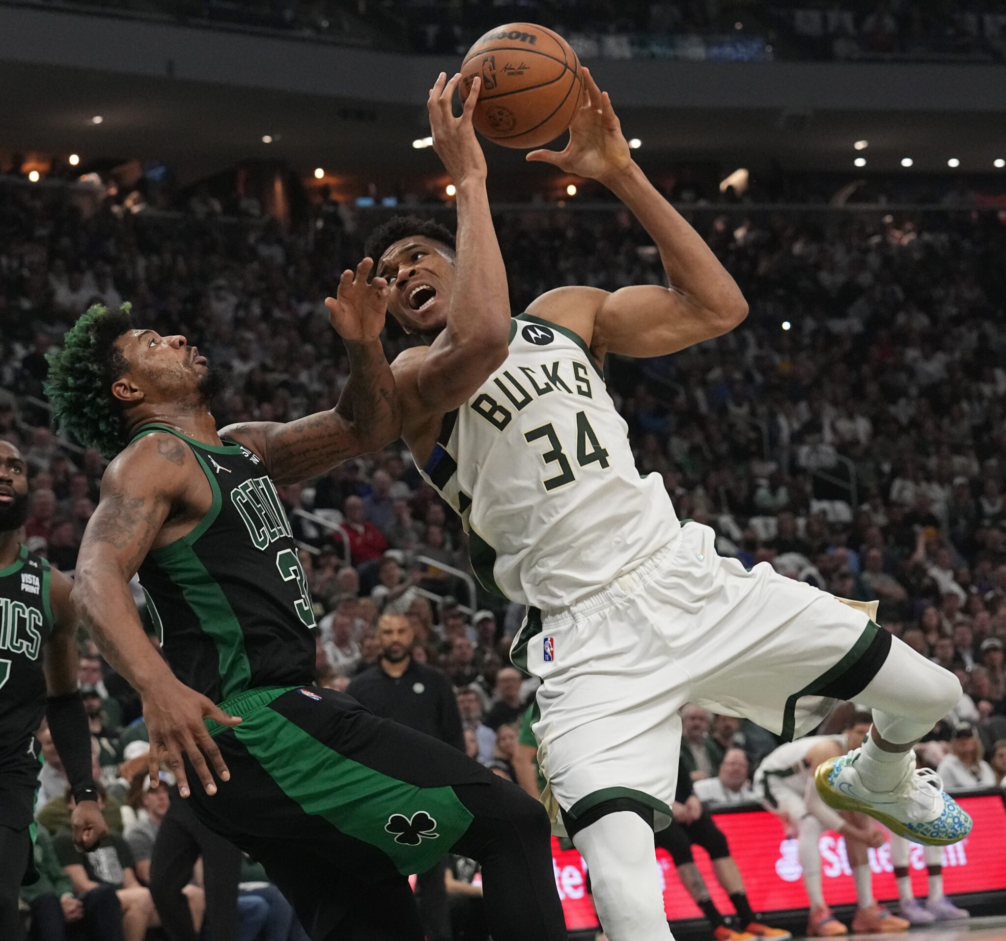 Giannis Antetokounmpo especially has been very physical all series and Game 4 was no different. In one particular instance, he got tangled up with Marcus Smart and a somewhat comical sequence ensued.