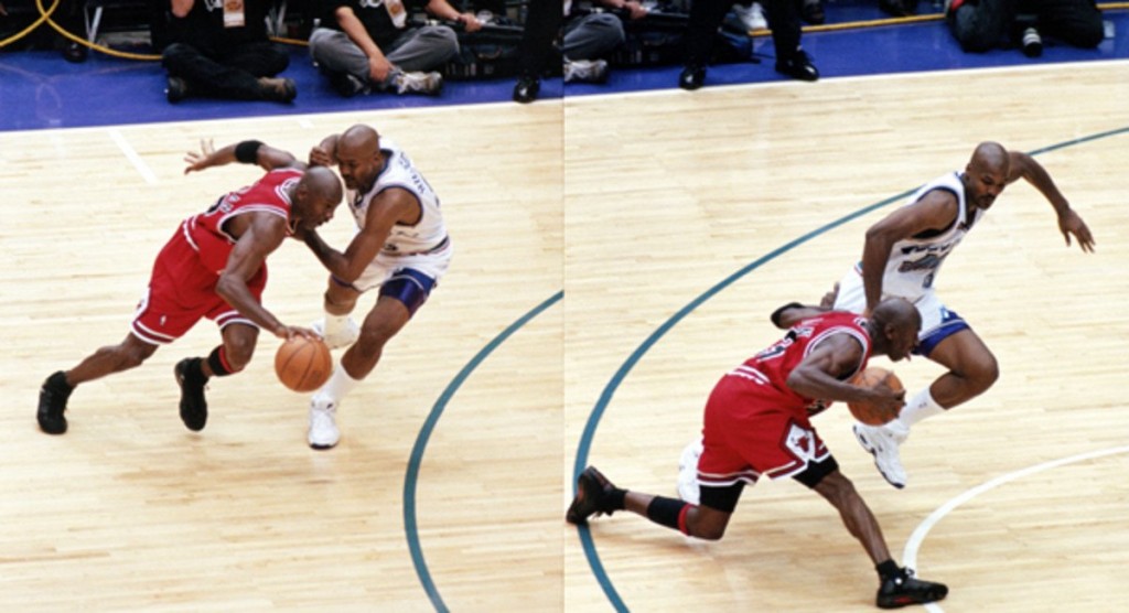 Jordan steals the ball from Karl Malone, the Bulls are down by one, 10 seconds left on the clock. He goes against Russell, goes right before crossing over to his left, with his left hand making contact with Russell’s left thigh. He gets enough space to make the shot, which would give the Bulls the lead and the victory.