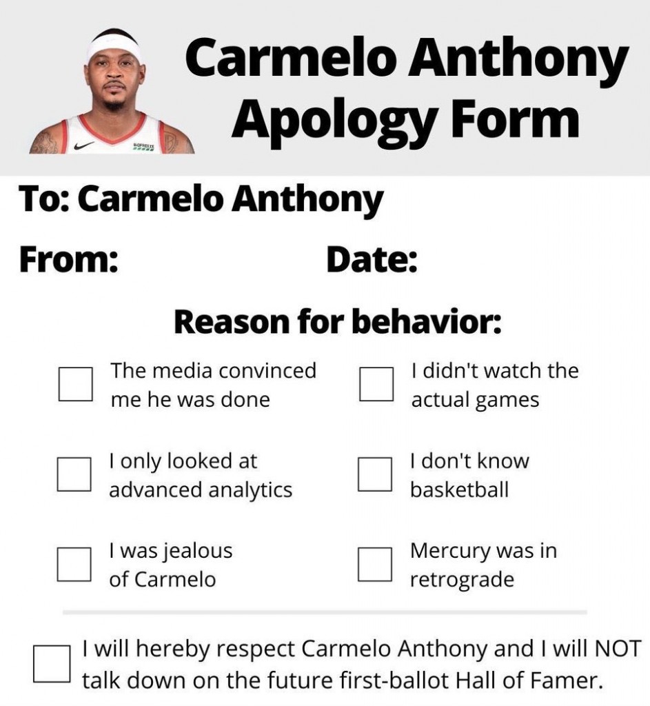 After that good performances, Twitter account ‘ContentNBA’ shared a Carmelo Anthony apology form, demanding haters to fill it after Melo’s big night. While some opposed to that, others accepted they were wrong and issued an apology for Melo.