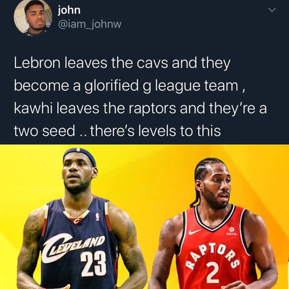 “Lebron leaves the cavs and they become a glorified g league team , kawhi leaves the raptors and they’re a two seed .. there’s levels to this,” @iam_johnw wrote on Twitter.