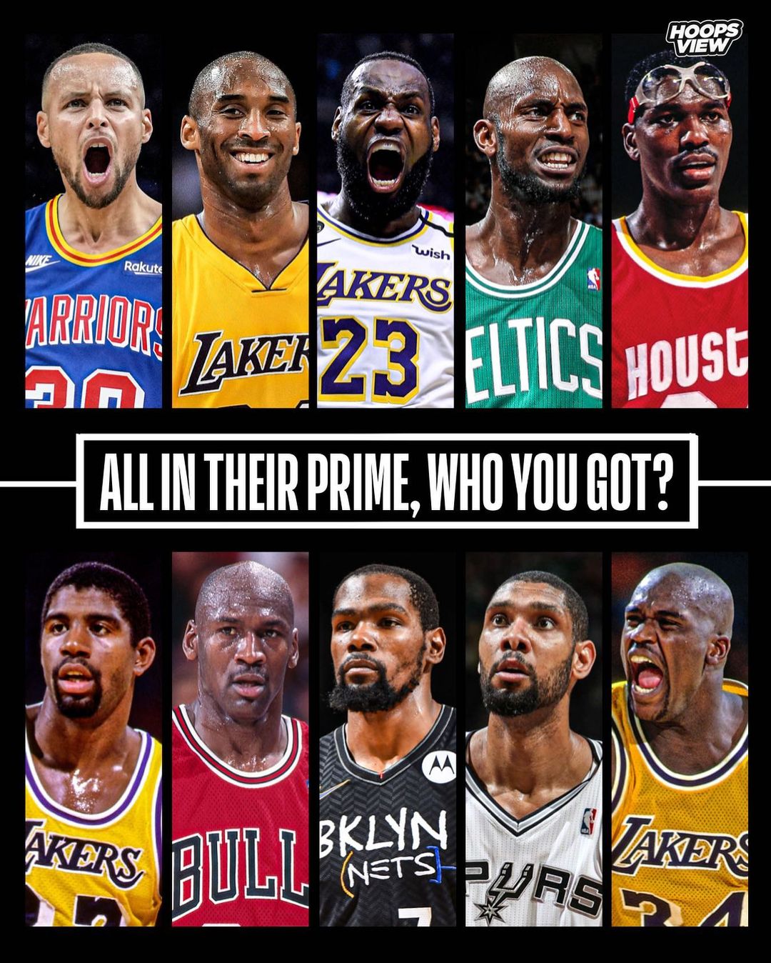 Instagram page “Hoopsview” had an idea like this, where they posted a graphic with 10 amazing NBA players and divided them into two teams. The top team had Stephen Curry, Kobe Bryant, LeBron James, Kevin Garnett, and Hakeem Olajuwon. On the other hand, the bottom team consists of Magic Johnson, Michael Jordan, Kevin Durant, Time Duncan, and Shaquille O’Neal.