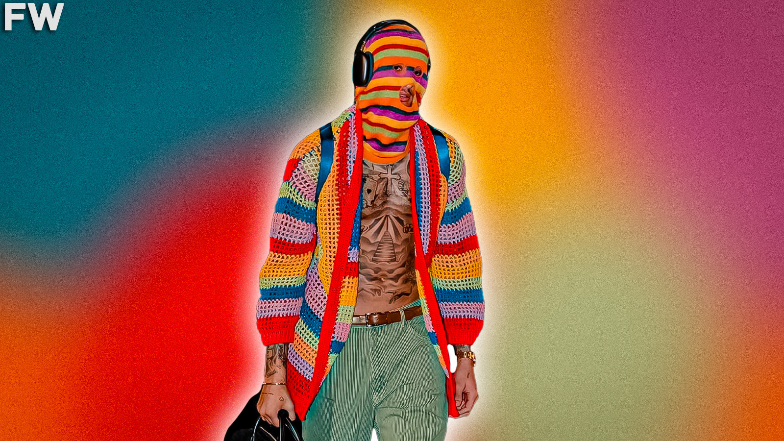 Between the no-shirt, open sweater look, and the weird rainbow-style balaclava, fans did not hold back on the jokes and memes.