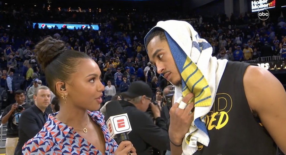 During his debut in the playoffs, Jordan Poole put up 30 points against the Denver Nuggets. After the game, he was interviewed by Malika Andrews about his performance. Many fans reacted to the interview, claiming that it looked as though Jordan Poole was flirting with Malika Andrews.