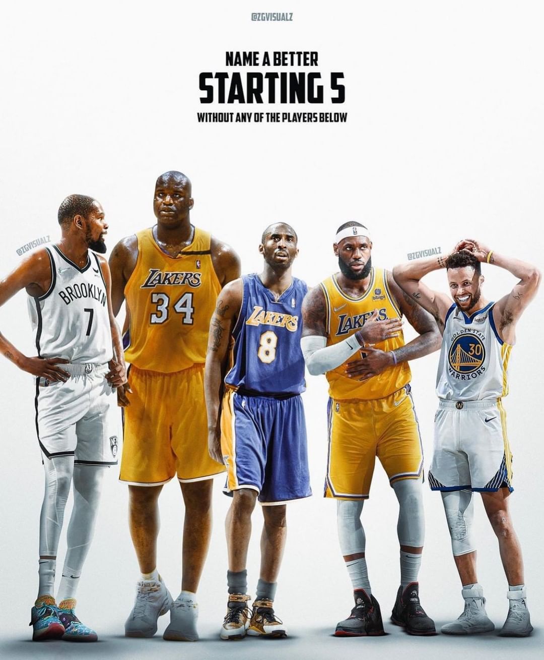 Kevin Durant, Shaquille O’Neal, Kobe Bryant, LeBron James and Stephen Curry all appear on the graphic, creating an incredible team that would give nightmares to any rival in the league.