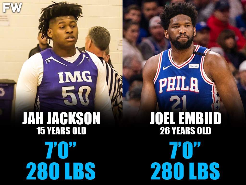 LeBron James is 6’9″ and 250 pounds. Zion Williamson comes in at 6’6″, 284 pounds. Joel Embiid is 7′ and 280 pounds. Jah, at just 14, is as tall and as heavy as Embiid and just four pounds lighter than Zion.