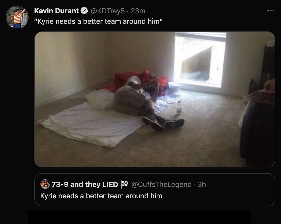 Every famous athlete is going to have haters, especially on a platform such as Twitter. Kyrie Irving is no different, and there was a recent tweet about him that suggested that Kyrie Irving needed a better team around him so he could win. Kevin Durant roasted the person who sent out that Tweet, repeating the man’s words and using an image of a man in a barren apartment on his phone, suggesting that the user is a broke Twitter troll.