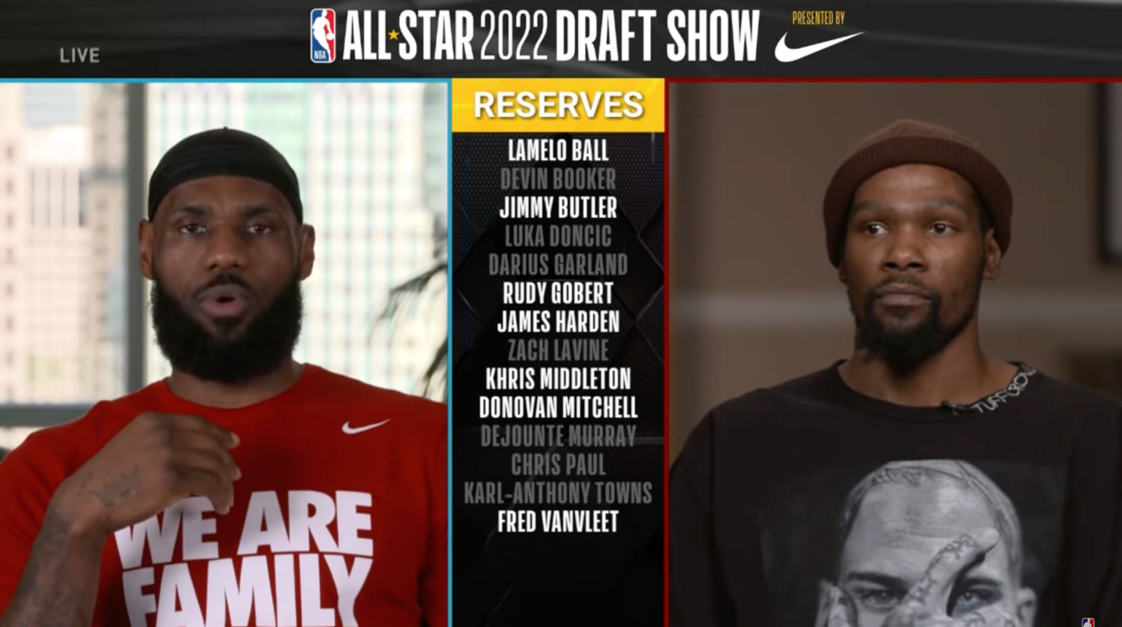 The draft for the 2022 All-Star game took place on Thursday after the trade deadline had ended, which meant there was a huge elephant in the room related to Kevin Durant. James Harden had just been traded for Ben Simmons a year after forming the Big 3 in Brooklyn with KD and Kyrie Irving. Harden is an All-Star reserve this season so of course, his name was on the board as well, making things a tad awkward for Durant.