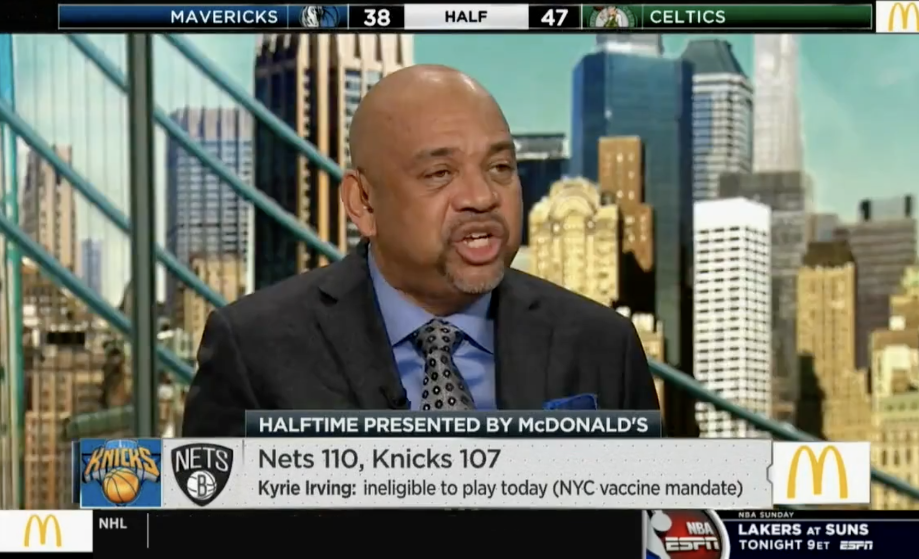 “Kevin Durant is too aware and too plugged-in to say something that impertinent. What’s the point of that? Want’s some attention? You wanna call out somebody, call out your teammate. Tell him to get a shot. He’s got plenty of them cause he couldn’t have gone to grade school in metropolitan New York without the vaccine.